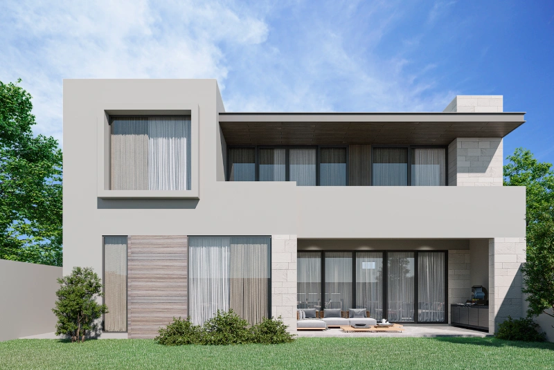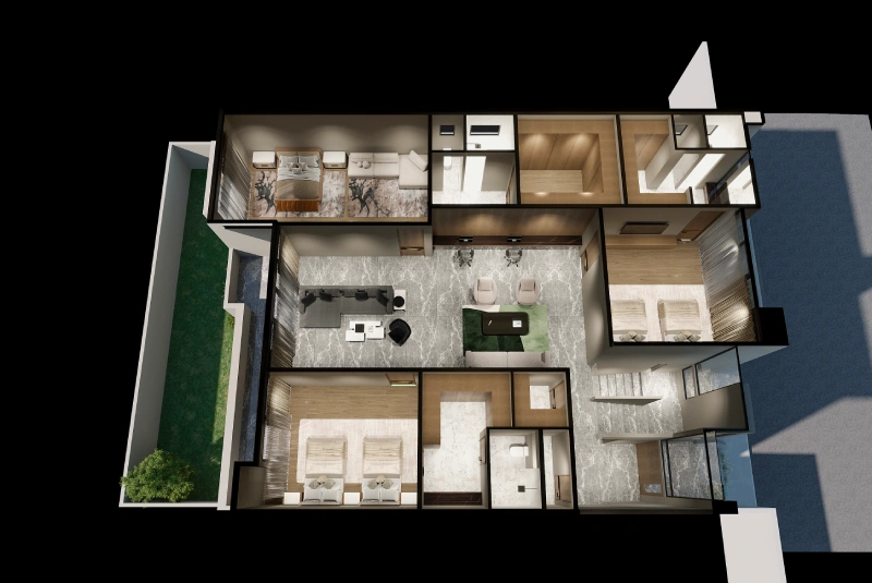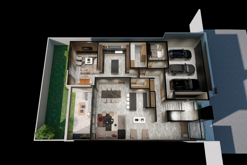 Cochera para 3 autos, baño de visitas, bar, sala, comedor, cocina, cuarto de alacena, cuarto de TV, terraza, patio, cuarto de servicio, cuarto de lavado.